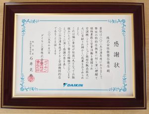 ダイキン工業株式会社様より感謝状を拝受いたしました。